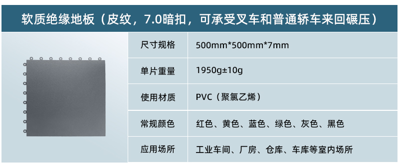 軟質(zhì)絕緣地板采用純新軟性PVC(聚氯乙烯)生產(chǎn)而成,具有防滑、防油、靜音、抗沖擊、高承載等特點(diǎn),可以快捷安裝在任何現(xiàn)有的基板,包括木材,混凝土,環(huán)氧樹脂,瓷磚,水磨石等,廣泛應(yīng)用于車間廠房地面、倉(cāng)庫地面、車庫地面、健身房、展廳等場(chǎng)所。